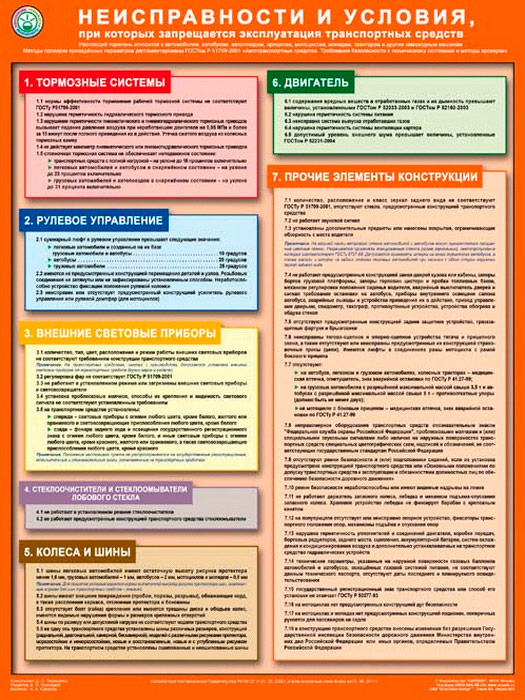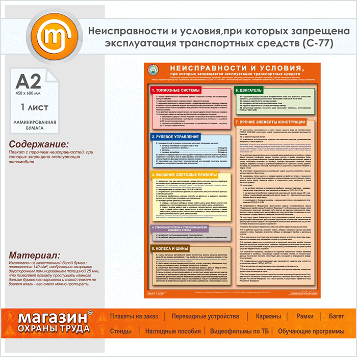 Плакат «Неисправности и условия, при которых запрещена эксплуатация транспортных средств» (С-77, ламинированная бумага, А2, 1 лист) в Старом Осколе купить