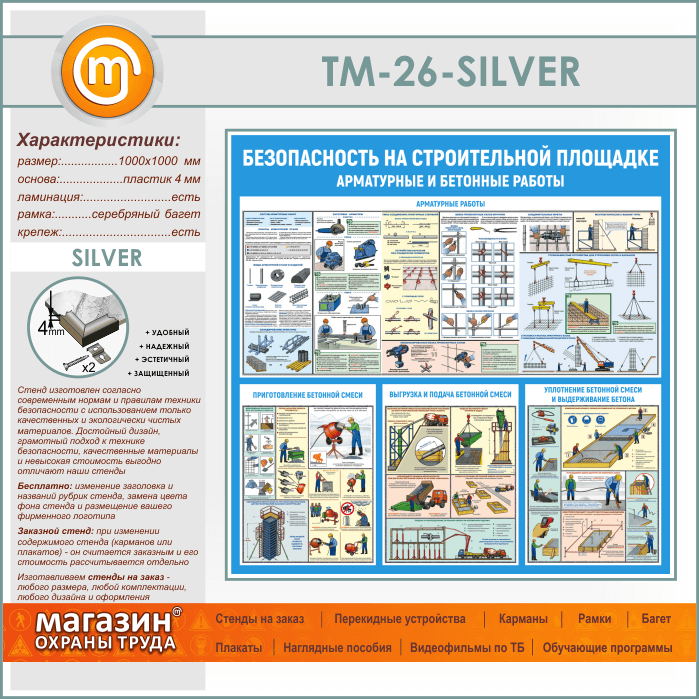 Стенд «Безопасность на строительной площадке. Арматурные и бетонные работы» (TM-26-SILVER) в Старом Осколе купить