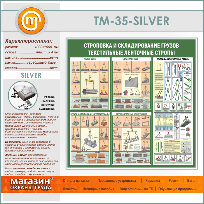 Стенд «Строповка и складирование грузов. Текстильные ленточные стропы» (TM-35-SILVER) в Старом Осколе купить