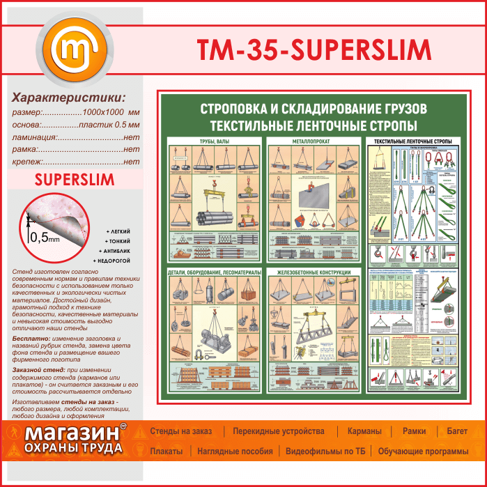 Стенд «Строповка и складирование грузов. Текстильные ленточные стропы» (TM-35-SUPERSLIM) в Старом Осколе купить