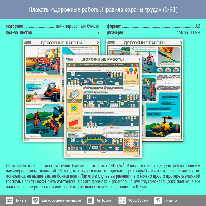 Плакаты «Дорожные работы. Правила охраны труда» (С-91, ламинированная бумага, А2, 3 листа) в Старом Осколе купить
