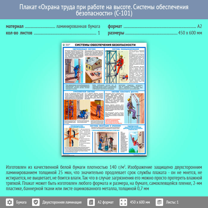 Плакат «Охрана труда при работе на высоте. Системы обеспечения безопасности» (С-101, ламинированная бумага, А2, 1 лист) в Старом Осколе купить
