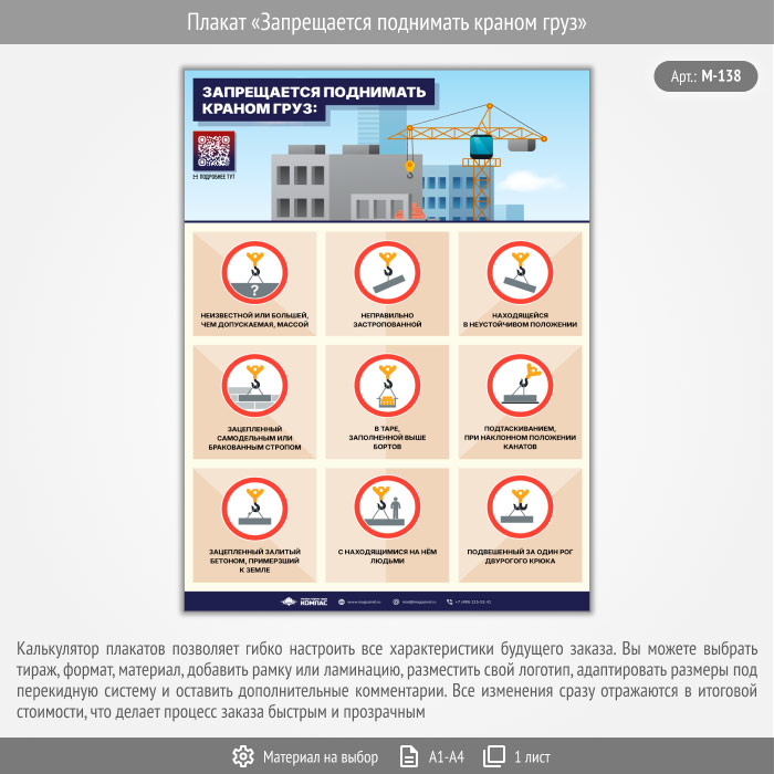 Плакат «Запрещается поднимать краном груз» с QR (М-138, 1 лист) в Старом Осколе купить