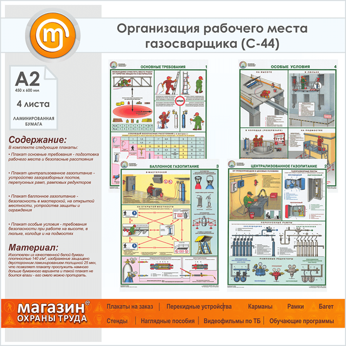 Плакаты «Организация рабочего места газосварщика» (С-44, ламинированная бумага, А2, 4 листа) в Старом Осколе купить