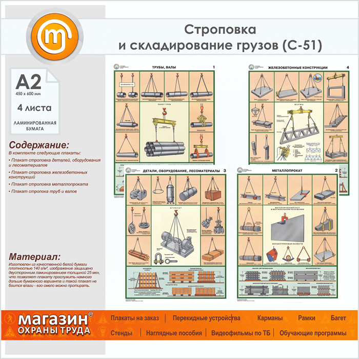 Плакаты «Строповка и складирование грузов» (С-51, ламинированная бумага, А2, 4 листа) в Старом Осколе купить