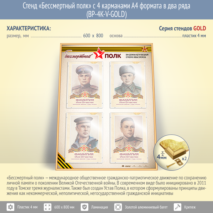 Стенд «Бессмертный полк» с 4 карманами А4 формата в два ряда (BP-4K-V-GOLD) в Старом Осколе купить