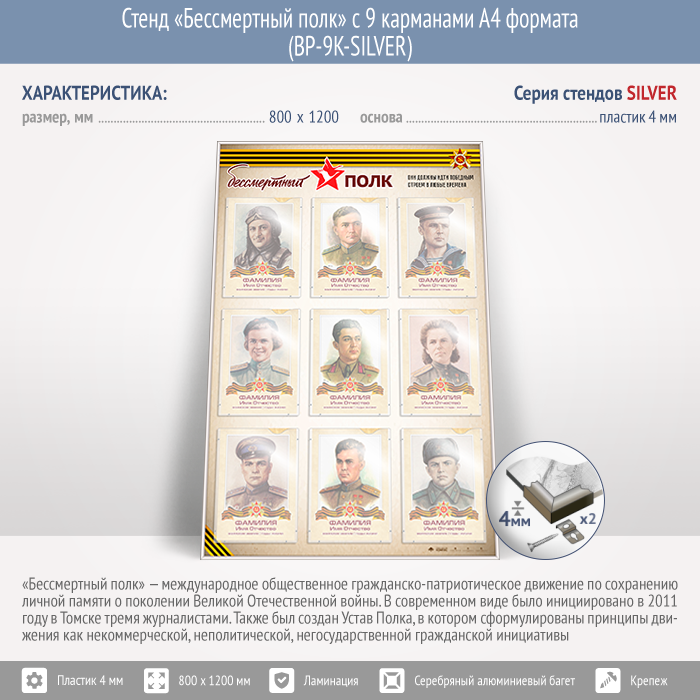 Стенд «Бессмертный полк» с 9 карманами А4 формата (BP-9K-SILVER) в Старом Осколе купить