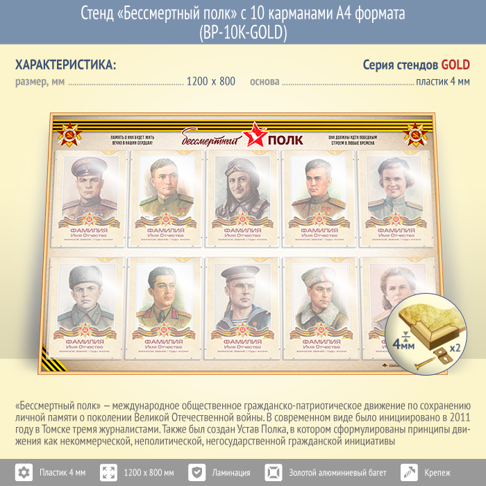 Стенд «Бессмертный полк» с 10 карманами А4 формата (BP-10K-GOLD) в Старом Осколе купить