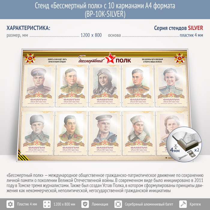 Стенд «Бессмертный полк» с 10 карманами А4 формата (BP-10K-SILVER) в Старом Осколе купить