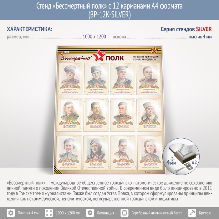Стенд «Бессмертный полк» с 12 карманами А4 формата (BP-12K-SILVER) в Старом Осколе купить