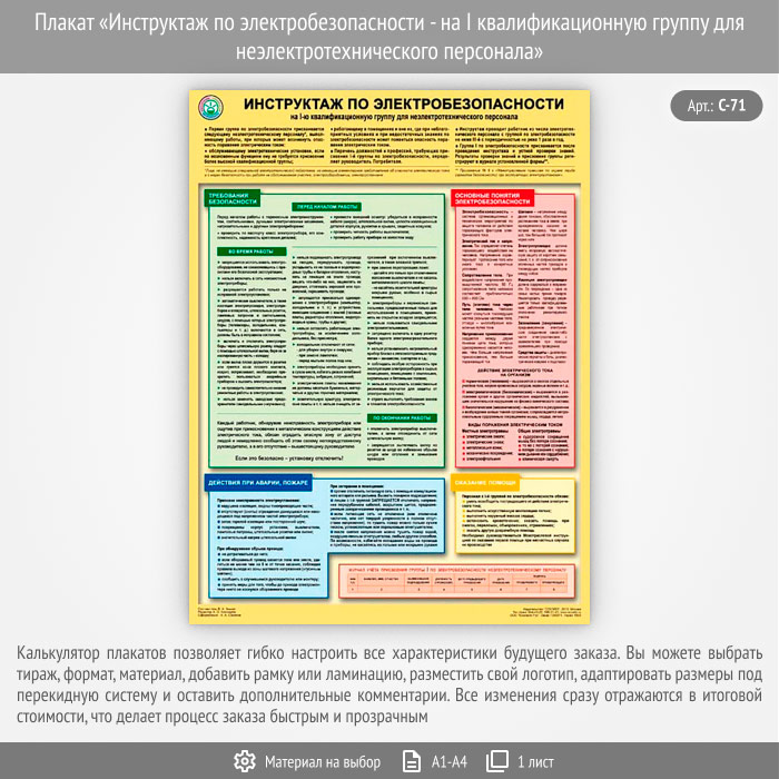 Плакат «Инструктаж по электробезопасности - на I квалификационную группу для неэлектротехнического персонала» (С-71, 1 лист) в Старом Осколе купить