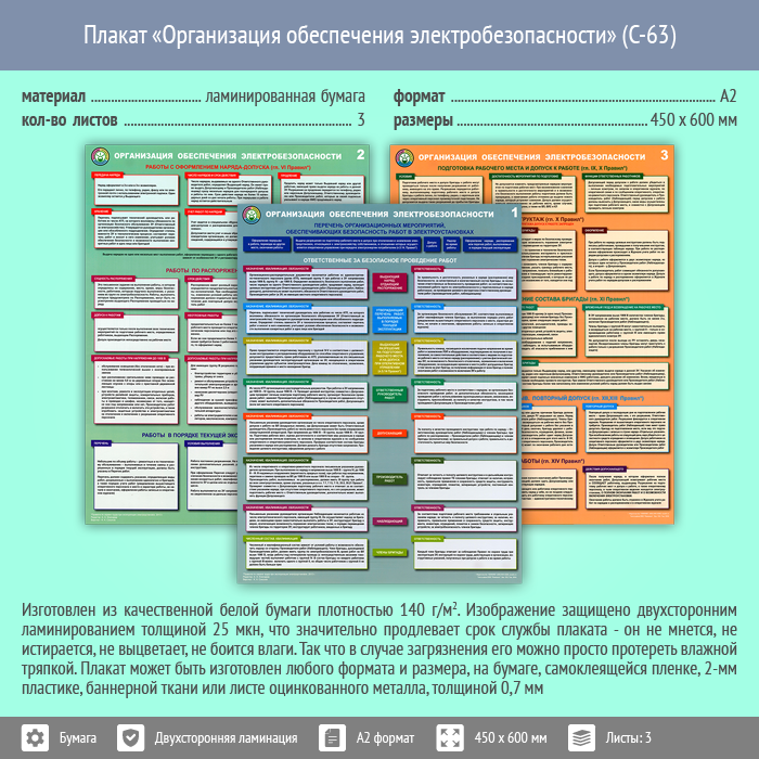 Плакаты «Организация обеспечения электробезопасности» (С-63, ламинированная бумага, А2, 3 листа) в Старом Осколе купить