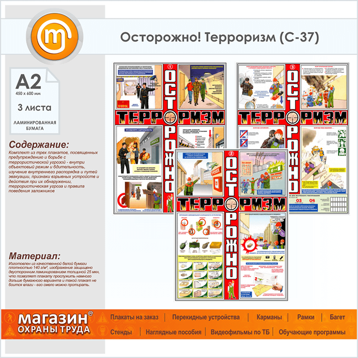 Плакаты «Осторожно! Терроризм» (С-37, ламинированная бумага, А2, 3 листа) в Старом Осколе купить