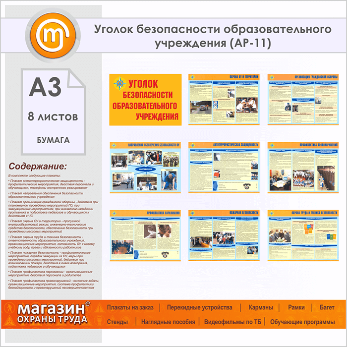 Плакаты «Уголок безопасности образовательного учреждения» (АР-11, бумага, А3, 8 листов) в Старом Осколе купить