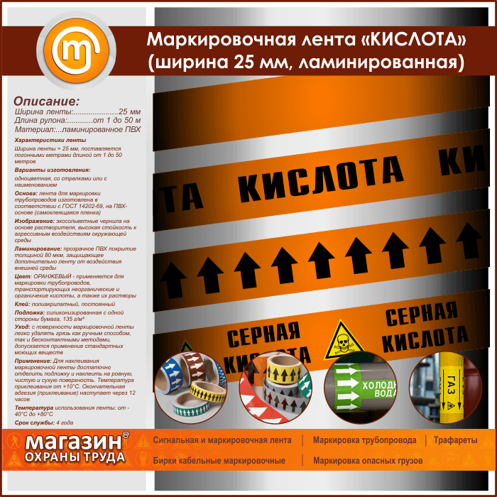 Маркировочная самоклеящаяся лента «КИСЛОТА» имеет ОРАНЖЕВЫЙ цвет и применяется для маркировки трубопроводов, транспортирующих неорганические и органические кислоты, а также их растворы. Поставляется погонными метрами длиной от 1 до 50 метров. Изготавливается одноцветной, со стрелками или с наименованием