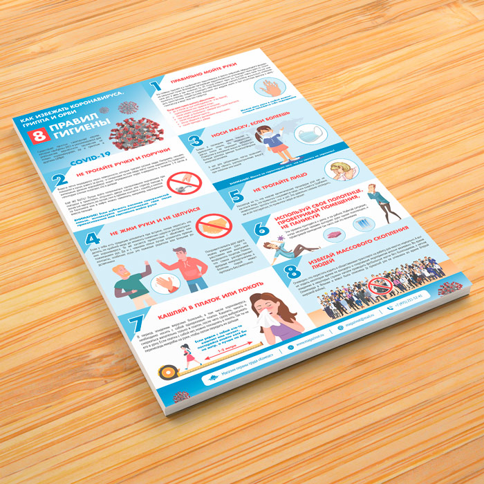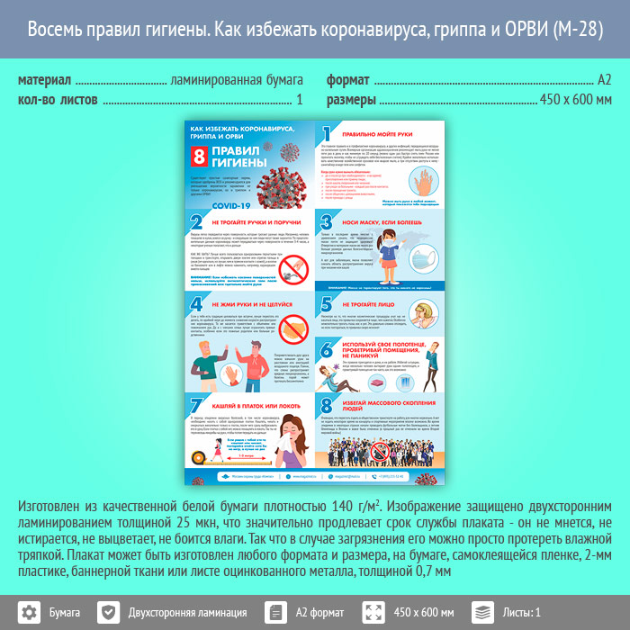 Плакат «Восемь правил гигиены. Как избежать коронавируса, гриппа и ОРВИ» (М-28, ламинированная бумага, А2, 1 лист) в Старом Осколе купить