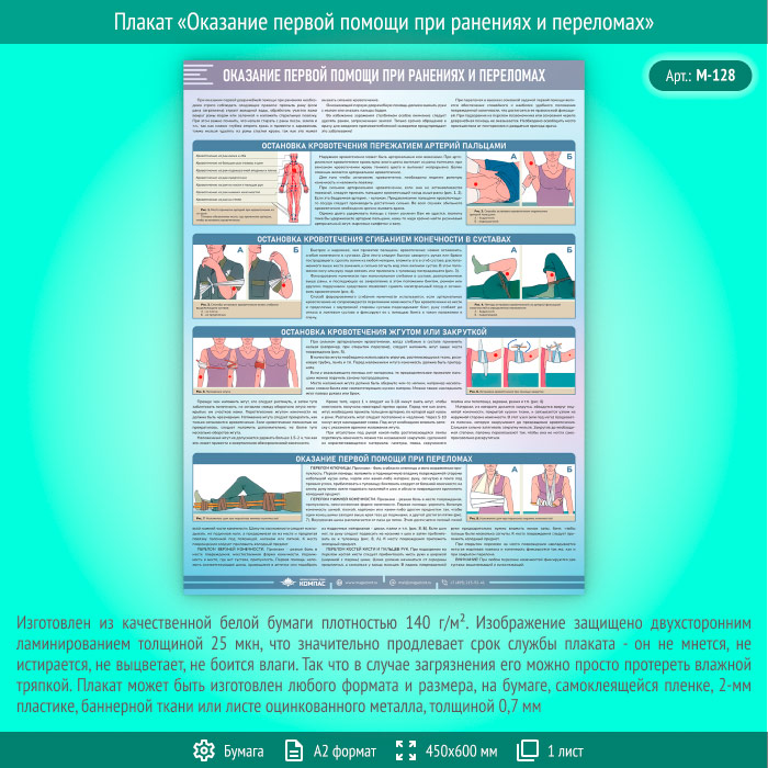 Плакат «Оказание первой помощи при ранениях и переломах» (М-128, ламинированная бумага, А2, 1 лист) в Старом Осколе купить