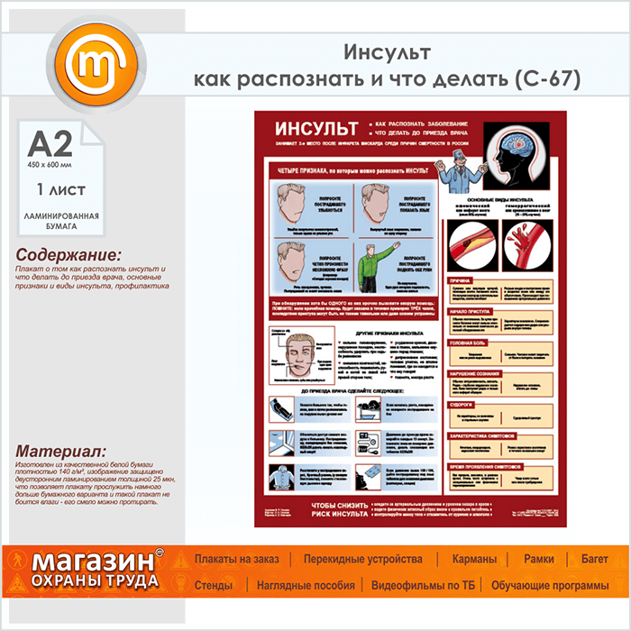 Плакат «Инсульт - как распознать и что делать» (С-67, ламинированная бумага, А2, 1 лист) в Старом Осколе купить