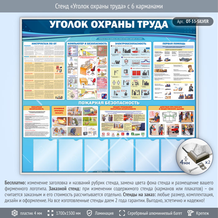 Стенд «Уголок охраны труда» с 6 карманами (OT-33-SILVER) в Старом Осколе купить