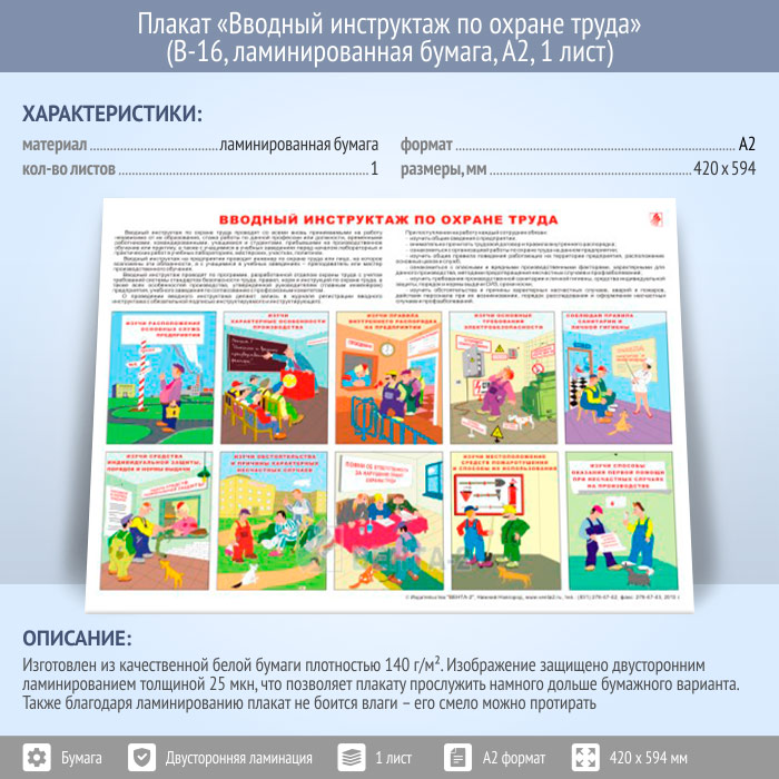 Плакат «Вводный инструктаж по охране труда» (В-16, ламинированная бумага, А2, 1 лист) в Старом Осколе купить