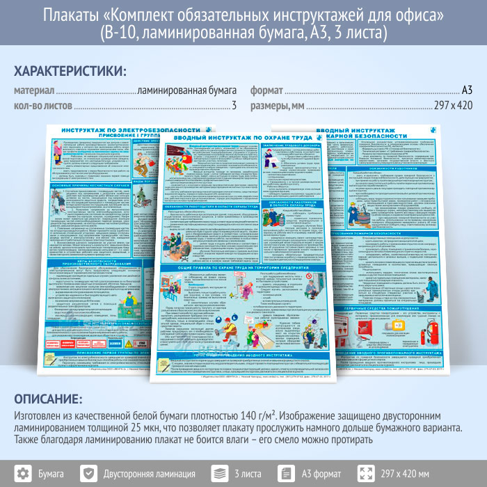 Плакаты «Комплект обязательных инструктажей для офиса» (В-10, ламинированная бумага, А3, 3 листа) в Старом Осколе купить