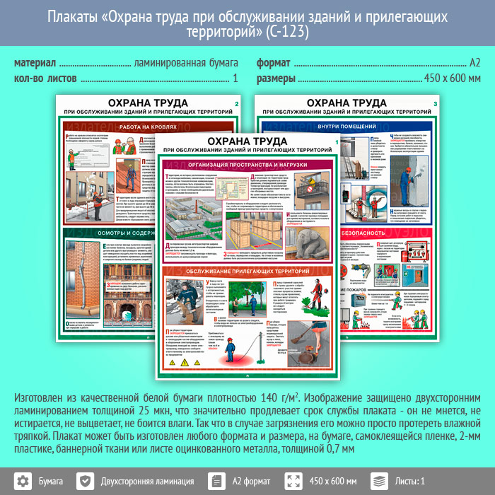 Плакаты «Охрана труда при обслуживании зданий и прилегающих территорий» (С-123, ламинированная бумага, А2, 3 листа) в Старом Осколе купить