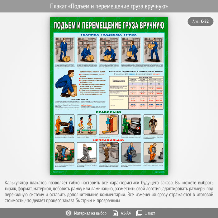Плакат «Подъем и перемещение груза вручную» (С-82, 1 лист) в Старом Осколе купить