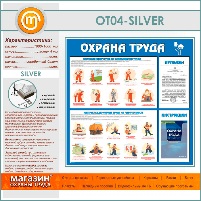 Стенд «Охрана труда» с плоским и объемным карманами (OT-04-SILVER) в Старом Осколе купить