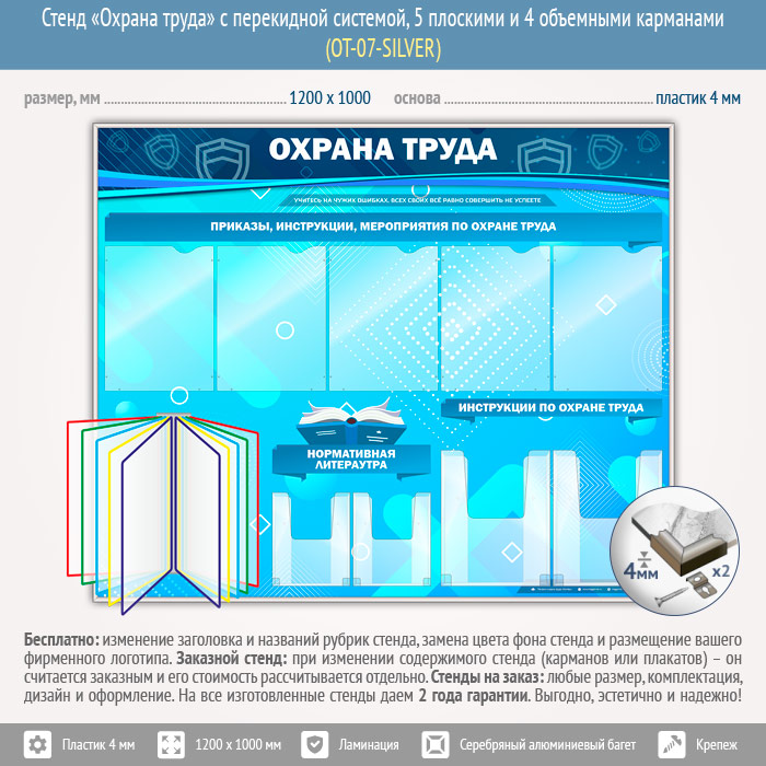 Стенд «Охрана труда» с перекидной системой, 5 плоскими и 4 объемными карманами (OT-07-SILVER) в Старом Осколе купить