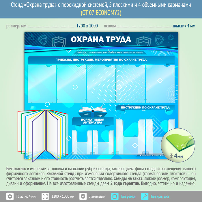 Стенд «Охрана труда» с перекидной системой, 5 плоскими и 4 объемными карманами (OT-07-ECONOMY2) в Старом Осколе купить