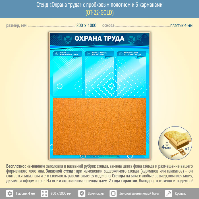 Стенд «Охрана труда» с пробковым полотном и 3 карманами (OT-22-GOLD) в Старом Осколе купить