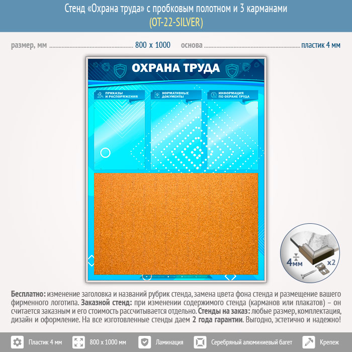 Стенд «Охрана труда» с пробковым полотном и 3 карманами (OT-22-SILVER) в Старом Осколе купить