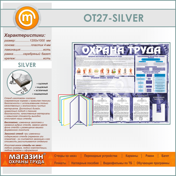 Стенд «Охрана труда» с перекидной системой, 3 плоскими и 1 объемным карманом (OT-27-SILVER) в Старом Осколе купить