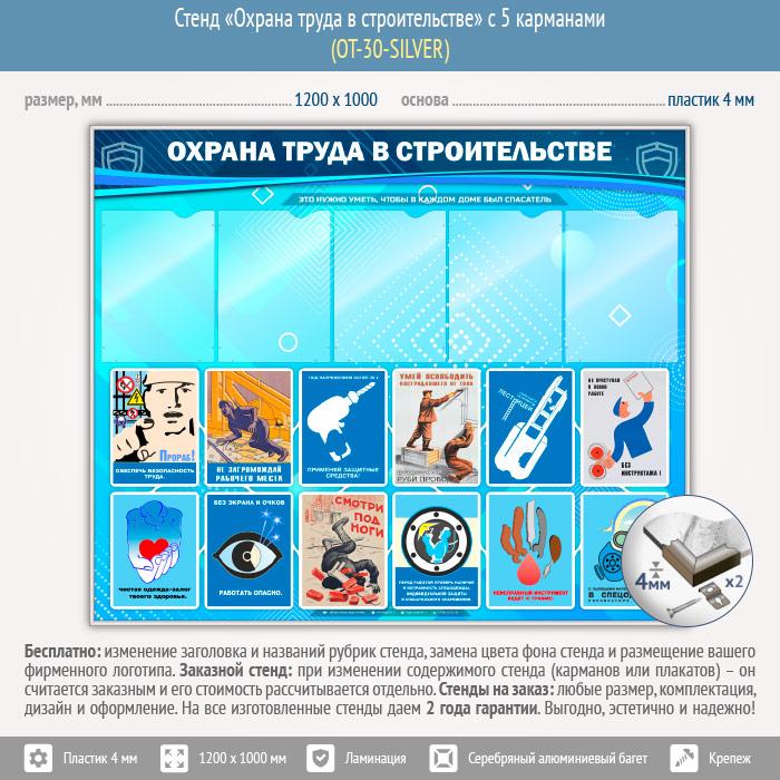 Стенд «Охрана труда в строительстве» с 5 карманами (OT-30-SILVER) в Старом Осколе купить