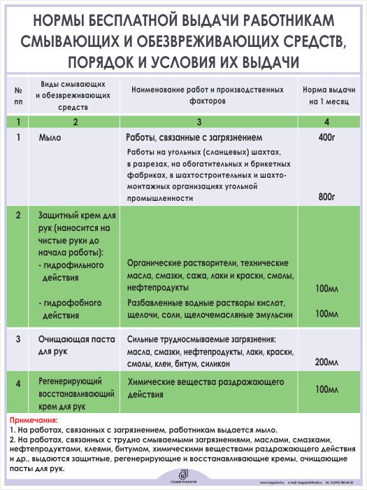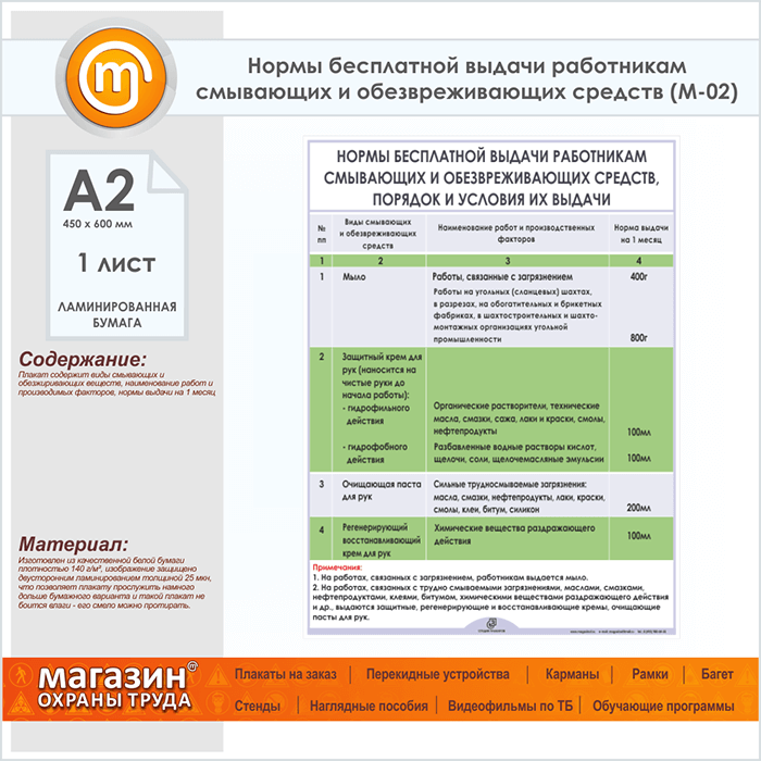 Плакат «Нормы бесплатной выдачи работникам смывающих и обезвреживающих средств» (М-02, ламинированная бумага, А2, 1 лист) в Старом Осколе купить
