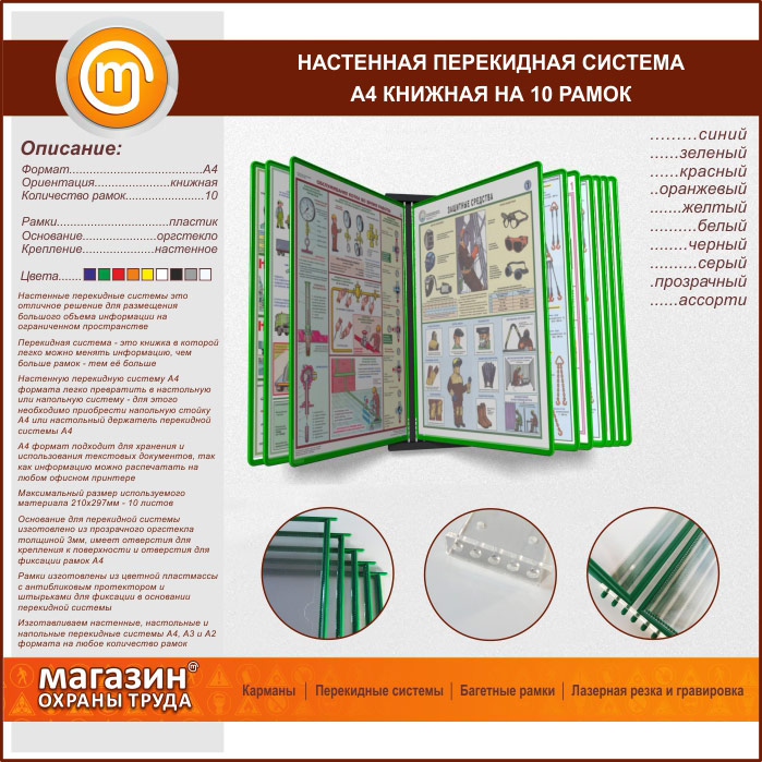 | Настенная перекидная система А4 на 10 рамок книжная | Настенная перекидная система А4 на 10 рамок книжная |