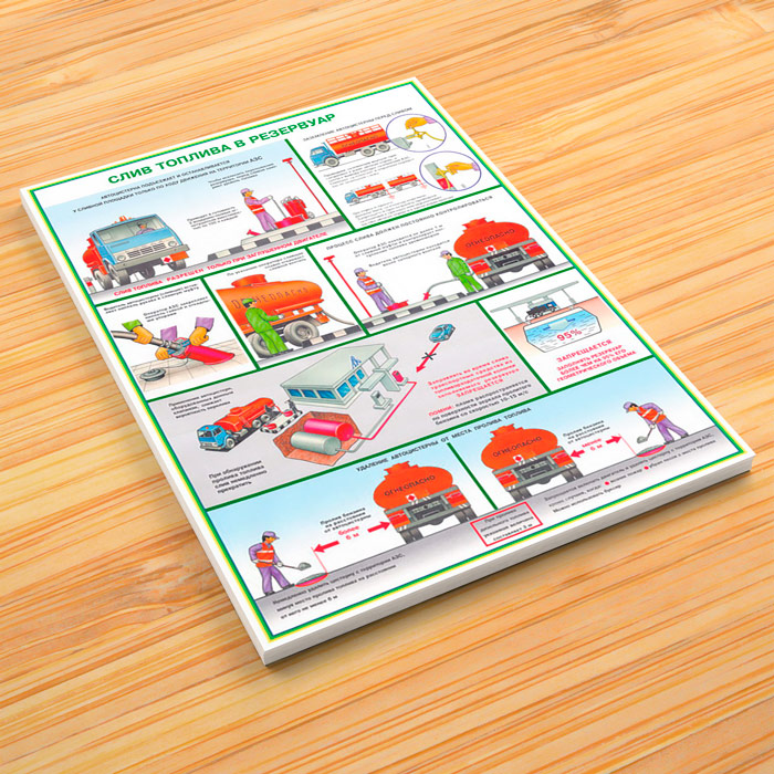 - Плакат «Слив топлива в резервуар» – порядок и процесс слива, заземление цистерны, пролив топлива