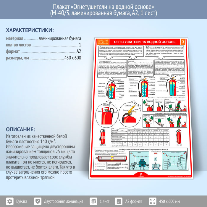 Плакат «Огнетушители на водной основе» (М-40/3, ламинированная бумага, А2, 1 лист) в Старом Осколе купить
