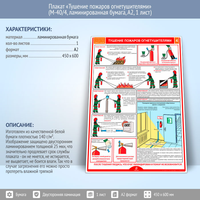 Плакат «Тушение пожаров огнетушителями» (М-40/4, ламинированная бумага, А2, 1 лист) в Старом Осколе купить