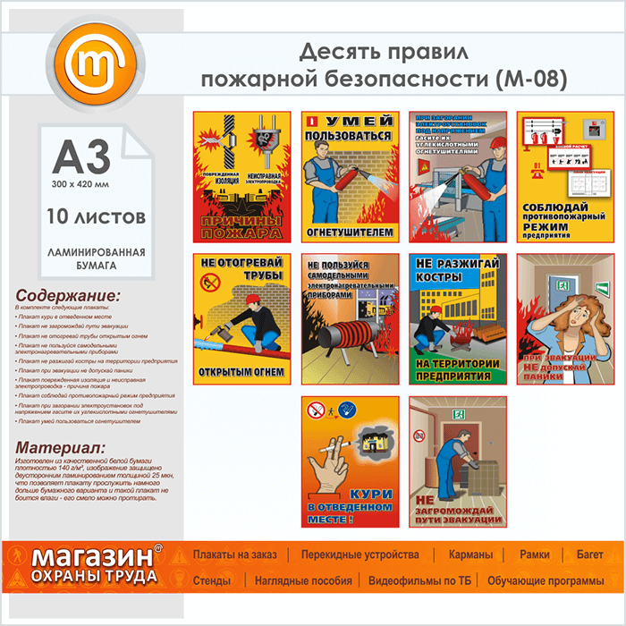Плакаты «Десять правил пожарной безопасности» (М-08, ламинированная бумага, А3, 10 листов) в Старом Осколе купить