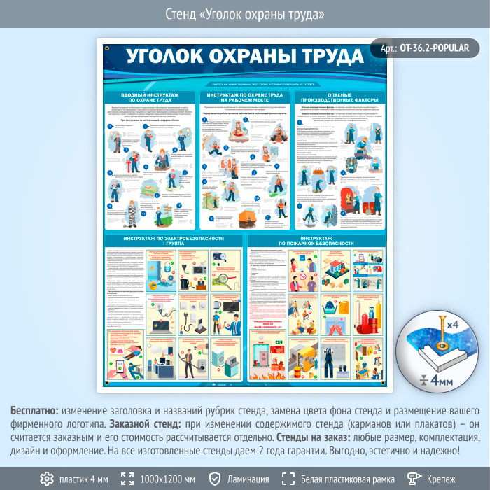 Стенд «Уголок охраны труда» (OT-36.2) содержит вводный инструктаж по ОТ, инструктаж по ОТ на рабочем месте, информацию об опасных производственных факторах, а также инструктажи по электробезопасности и по пожарной безопасности.