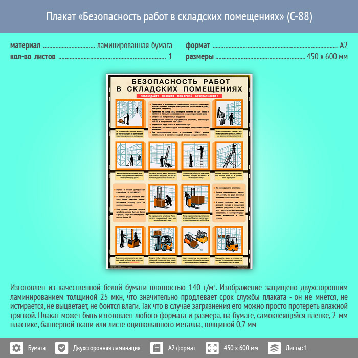 Плакат «Безопасность работ в складских помещениях» (С-88, ламинированная бумага, А2, 1 лист) в Старом Осколе купить