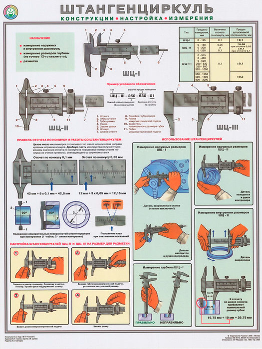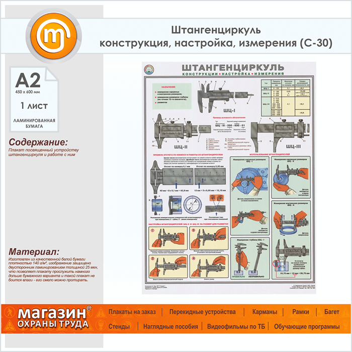 Плакат «Штангенциркуль - конструкция, настройка, измерения» (С-30, ламинированная бумага, А2, 1 лист) в Старом Осколе купить