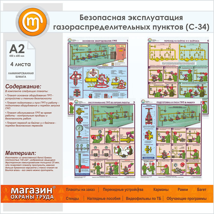 Плакаты «Безопасная эксплуатация газораспределительных пунктов» (С-34, ламинированная бумага, А2, 4 листа) в Старом Осколе купить